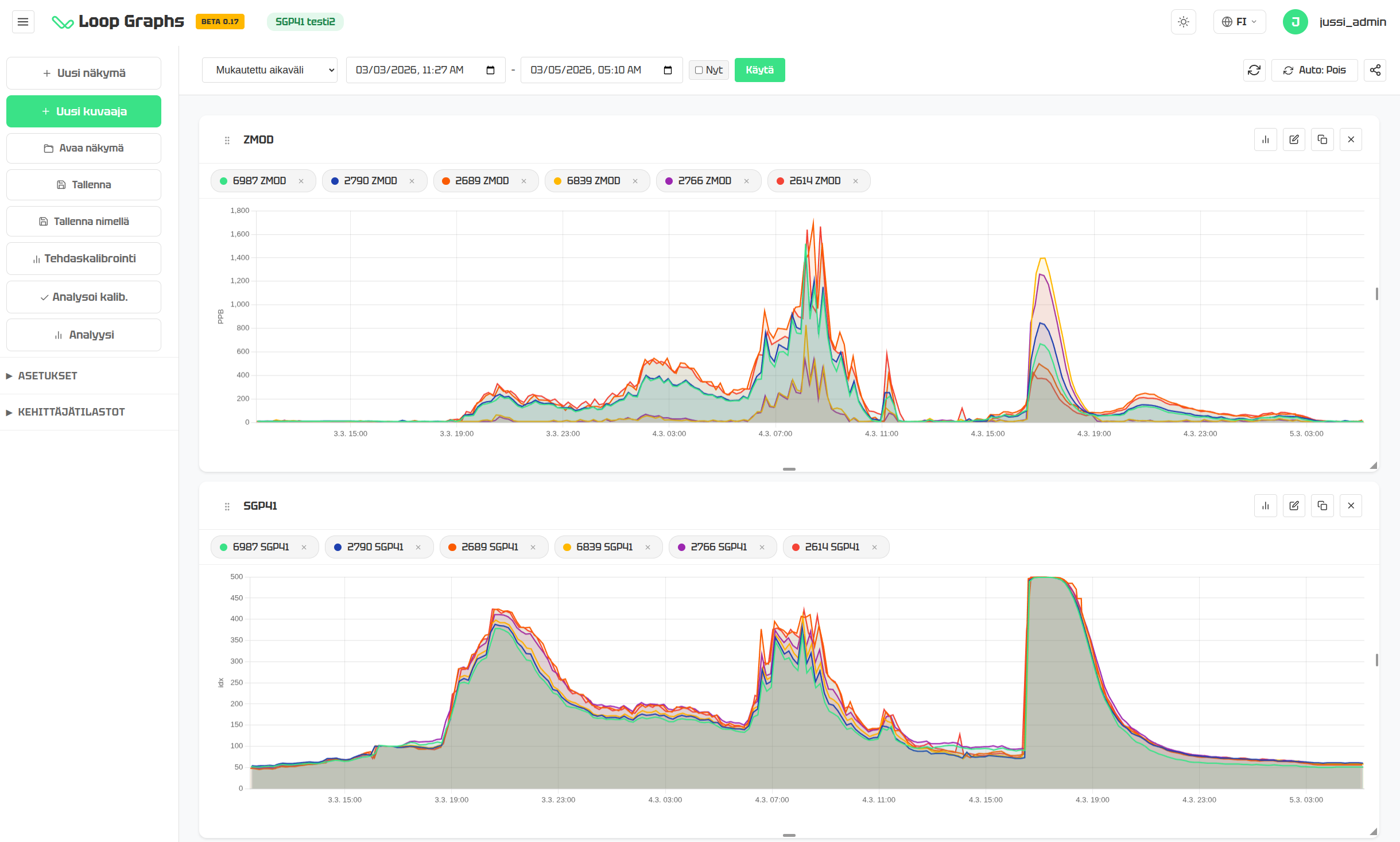SGP41-indeksi samoista laitteista samalta ajanjaksolta. Tapahtumat näkyvät yhä — mutta nyt käyrät kulkevat lähes päällekkäin. Laitteet kertovat saman tarinan.