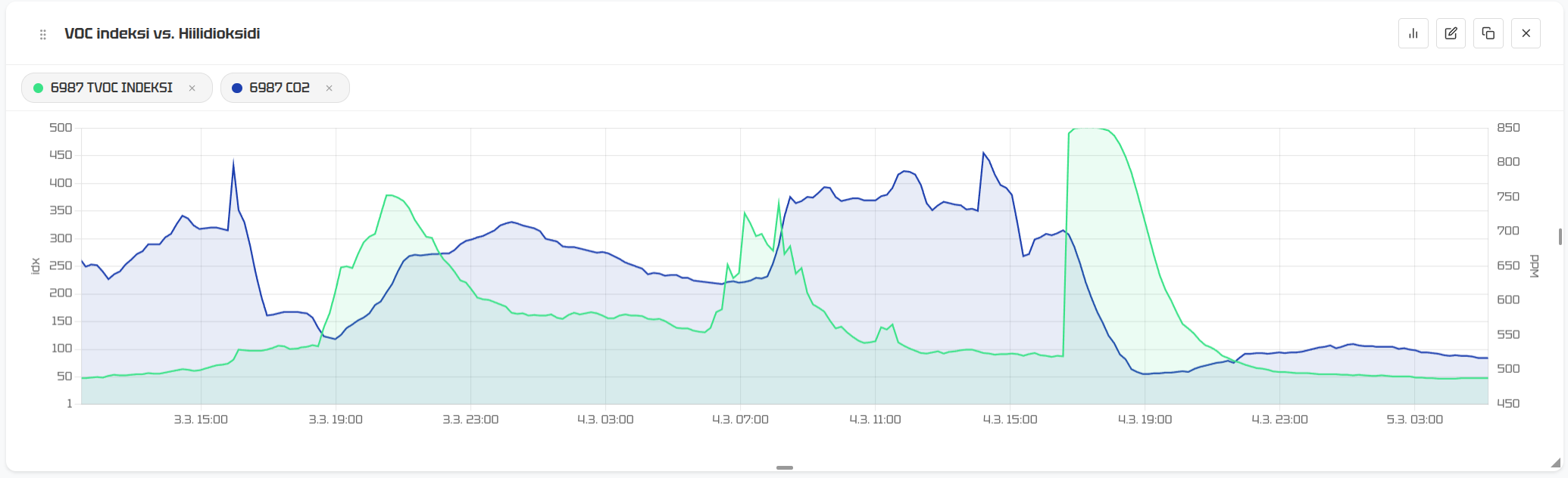 Tämä yhdistelmä on käytännössä erittäin hyödyllinen. Kun molemmat nousevat, kyse on todennäköisesti ihmistoiminnasta tai ilmanvaihdon riittämättömyydestä. Kun vain VOC nousee, lähde on kemiallinen.