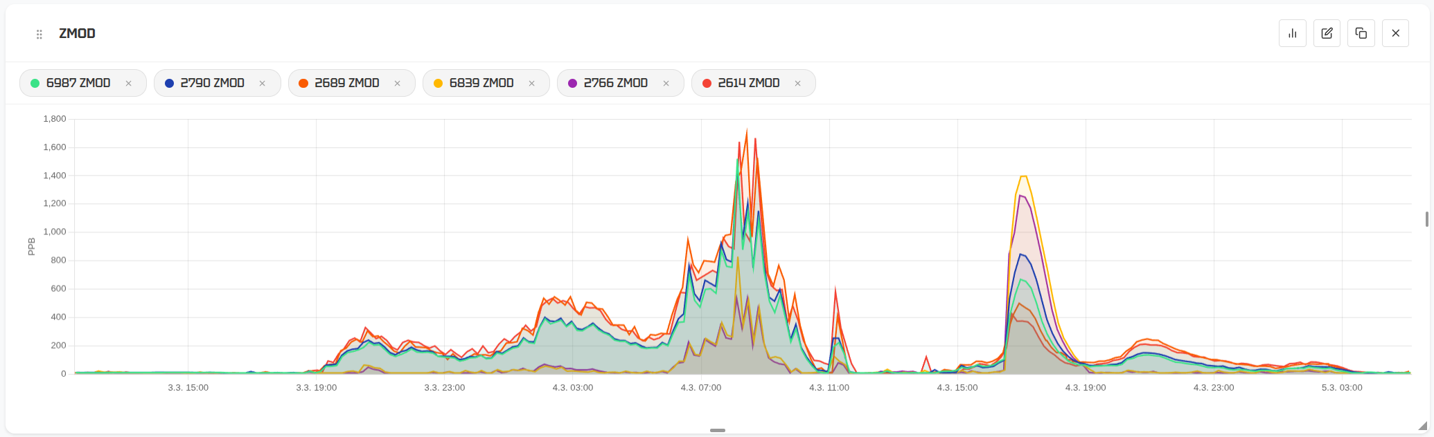 Tapahtumat kyllä näkyvät kaikissa laitteissa: samat piikit, sama trendi, sama rytmi. Mutta ppb-lukemat vaihtelevat — yhdellä laite näyttää piikissä lähes 1800 ppb, toisella alle 600 ppb samasta tapahtumasta. Kumpi on oikein? Todellisuudessa kumpikaan ei ole "väärässä" siinä mielessä, että laite olisi rikki — tämä on tunnistettu ominaisuus näille sensoreille.