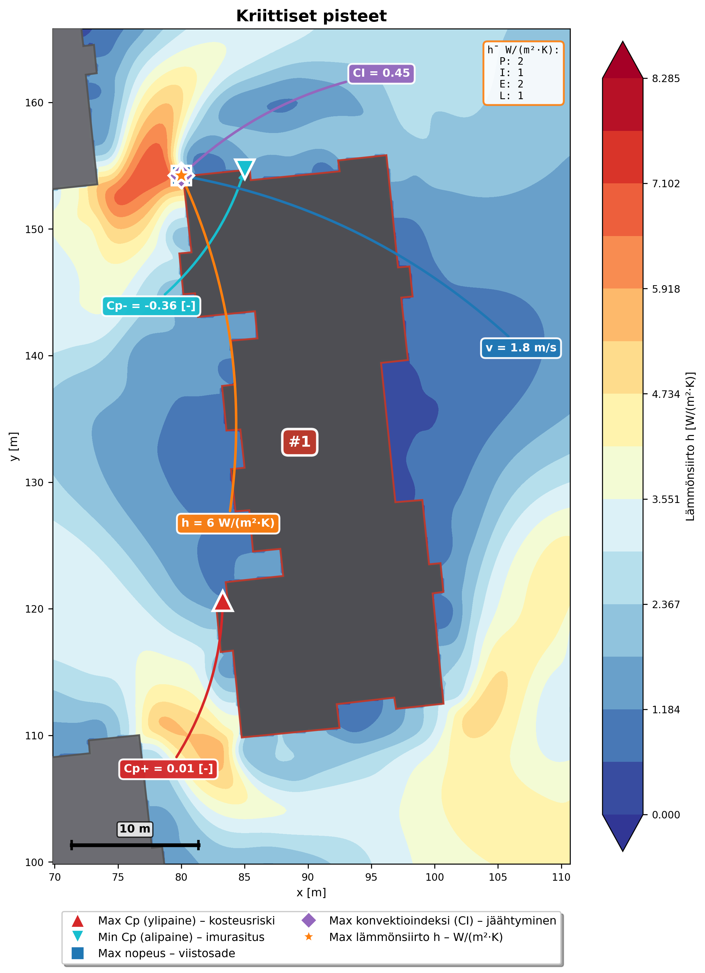 Näet, mitkä julkisivut, nurkat ja kattorakenteet altistuvat eniten tuulelle ja paine-eroille