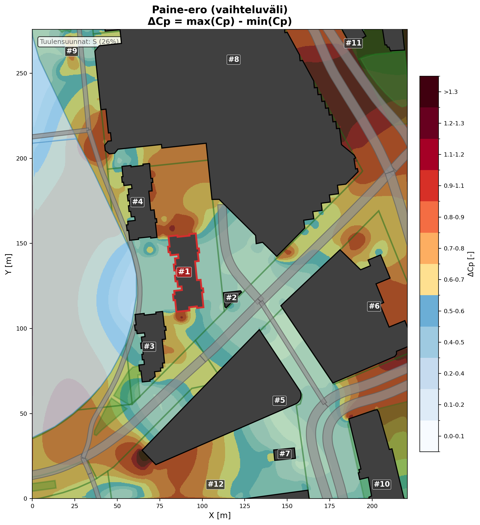 Väriskaala näyttää tuulen voimakkuuden. Virtaviivat paljastavat, mihin ilma kiihtyy, pyörteilee tai pysähtyy – usein juuri rakennuksen kulmissa ja julkisivuilla.