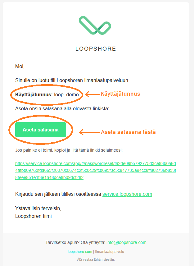 Sähköposti sisältää linkin, josta pääset asettamaan oman salasanasi.