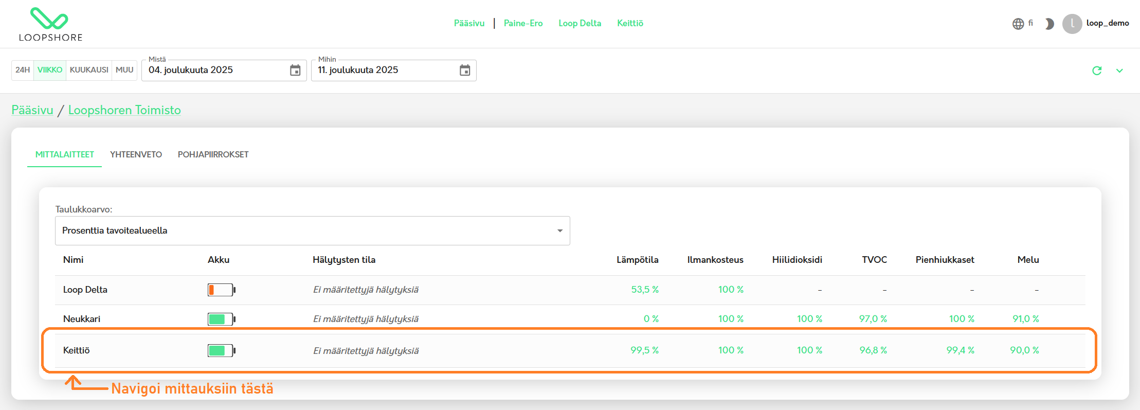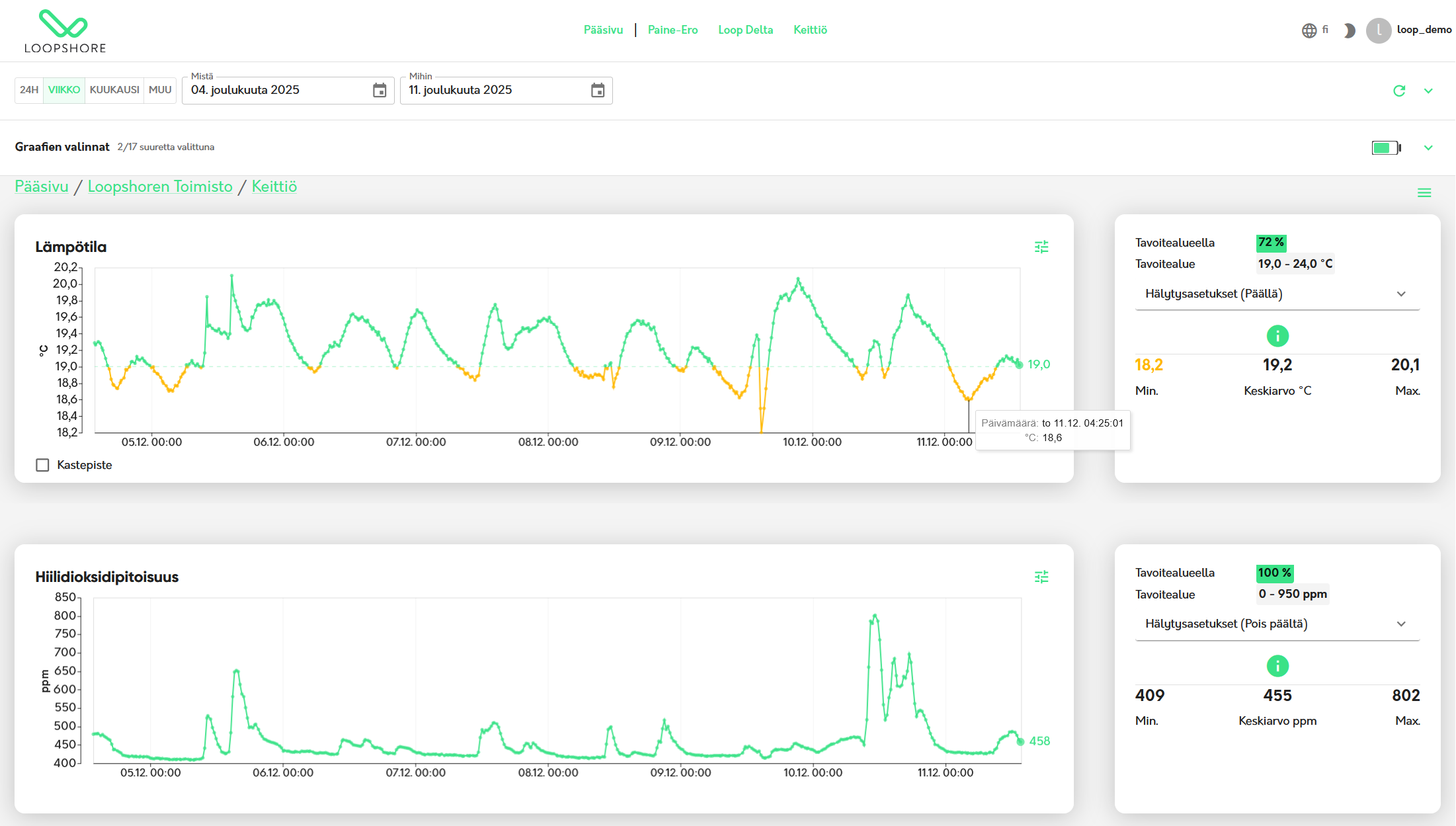 Tällä sivulla näet kaikki tähän tilaan liittyvät mittaukset. Voit mm. tarkastella dataa eri aikamääreillä, säätää kohteiden asetuksia, luoda pdf-raportteja tai tilata itsellesi hälytyksiä.