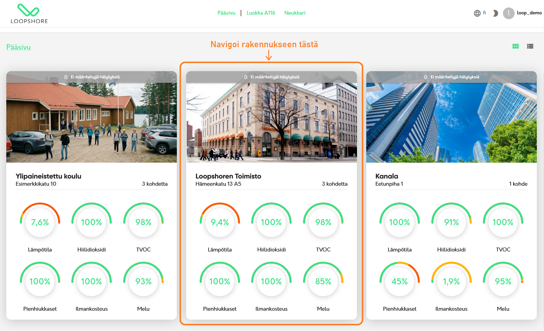 Kun olet kirjautunut palveluun, ensimmäisenä näet Rakennukset-sivun, jossa kaikki rakennuksesi näkyvät omina kortteinaan.